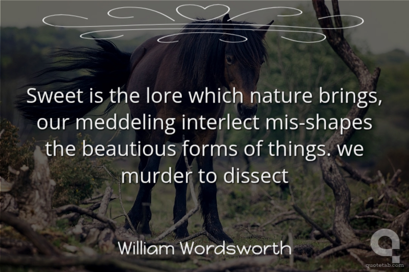 Sweet is the lore which Nature brings; Our meddling intellect Mis-shapes the beauteous forms of things We murder to dissect. Enough of Science and of Art; Close up these barren leaves; Come forth, and bring with you a heart That watches and receives.