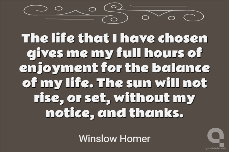 The life that I have chosen gives me my full hours of enjoyment for the balance of my life. The sun will not rise, or set, without my notice, and thanks.
