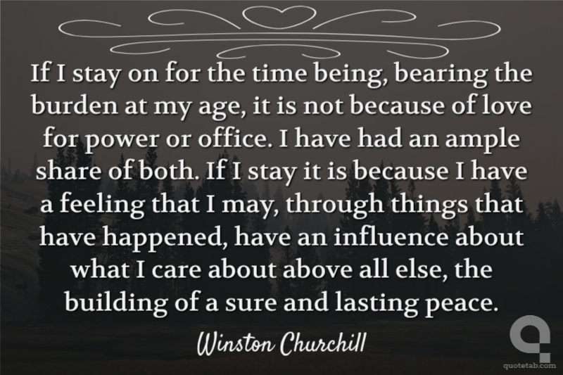 If I stay on for the time being, bearing the burden at my age, it is not because of love for power or office. I have had an ample share of both. If I stay it is because I have a feeling that I may, through things that have happened, have an influence about what I care about above all else, the building of a sure and lasting peace.