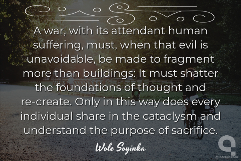 A war, with its attendant human suffering, must, when that evil is unavoidable, be made to fragment more than buildings: It must shatter the foundations of thought and re-create. Only in this way does every individual share in the cataclysm and understand the purpose of sacrifice.