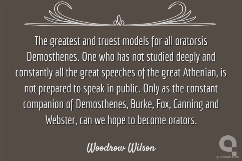 The greatest and truest models for all oratorsis Demosthenes. One who has not studied deeply and constantly all the great speeches of the great Athenian, is not prepared to speak in public. Only as the constant companion of Demosthenes, Burke, Fox, Canning and Webster, can we hope to become orators.