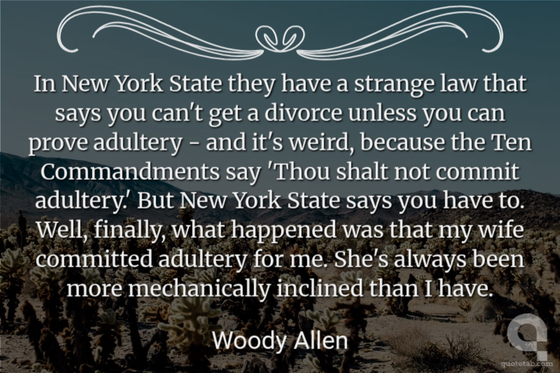 In New York State they have a strange law that says you can't get a divorce unless you can prove adultery - and it's weird, because the Ten Commandments say 'Thou shalt not commit adultery.' But New York State says you have to. Well, finally, what happened was that my wife committed adultery for me. She's always been more mechanically inclined than I have.