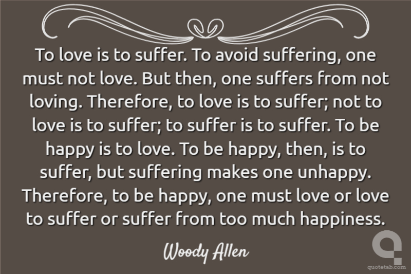 To love is to suffer. To avoid suffering, one must not love. But then, one suffers from not loving. Therefore, to love is to suffer; not to love is to suffer; to suffer is to suffer. To be happy is to love. To be happy, then, is to suffer, but suffering makes one unhappy. Therefore, to be happy, one must love or love to suffer or suffer from too much happiness.