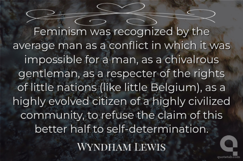 Feminism was recognized by the average man as a conflict in which it was impossible for a man, as a chivalrous gentleman, as a respecter of the rights of little nations (like little Belgium), as a highly evolved citizen of a highly civilized community, to refuse the claim of this better half to self-determination.