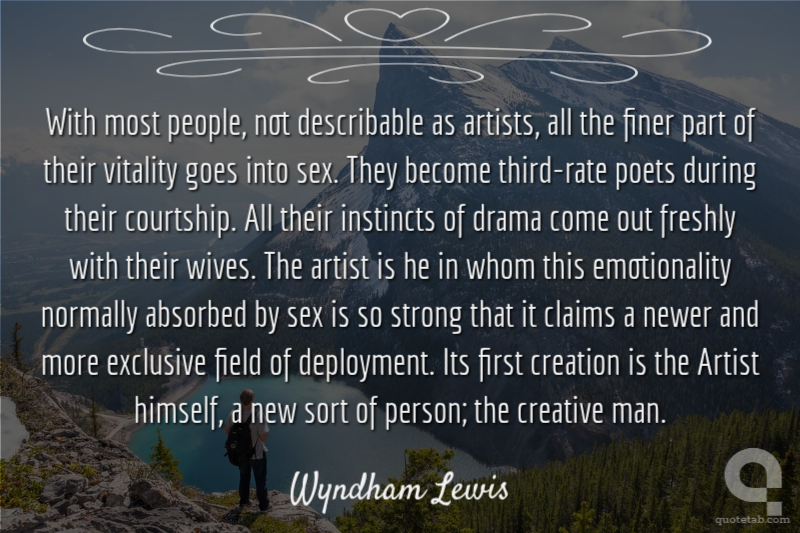 With most people, not describable as artists, all the finer part of their vitality goes into sex. They become third-rate poets during their courtship. All their instincts of drama come out freshly with their wives. The artist is he in whom this emotionality normally absorbed by sex is so strong that it claims a newer and more exclusive field of deployment. Its first creation is the Artist himself, a new sort of person; the creative man.