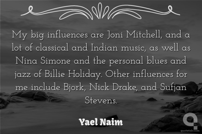 My big influences are Joni Mitchell, and a lot of classical and Indian music, as well as Nina Simone and the personal blues and jazz of Billie Holiday. Other influences for me include Bjork, Nick Drake, and Sufjan Stevens.