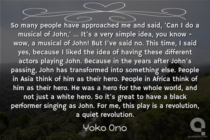 So many people have approached me and said, 'Can I do a musical of John,' ... It's a very simple idea, you know - wow, a musical of John! But I've said no. This time, I said yes, because I liked the idea of having these different actors playing John. Because in the years after John's passing, John has transformed into something else. People in Asia think of him as their hero. People in Africa think of him as their hero. He was a hero for the whole world, and not just a white hero. So it's great to have a black performer singing as John. For me, this play is a revolution, a quiet revolution.