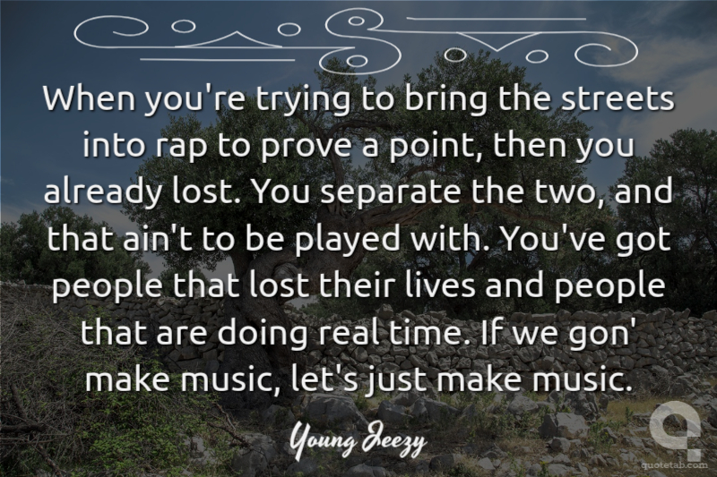 When you're trying to bring the streets into rap to prove a point, then you already lost. You separate the two, and that ain't to be played with. You've got people that lost their lives and people that are doing real time. If we gon' make music, let's just make music.