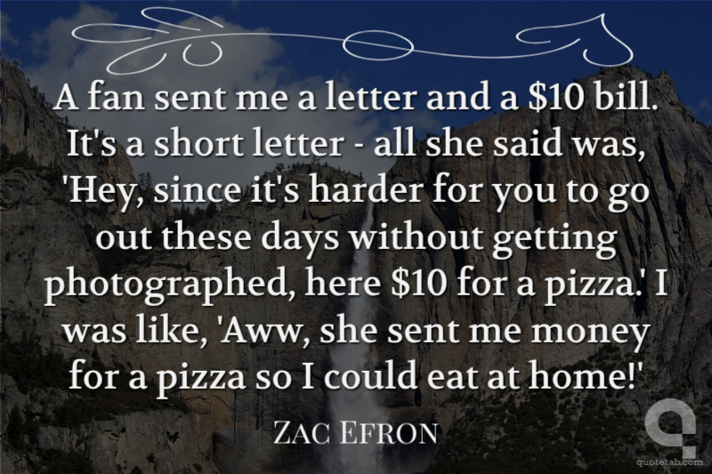 A fan sent me a letter and a $10 bill. It's a short letter - all she said was, 'Hey, since it's harder for you to go out these days without getting photographed, here $10 for a pizza.' I was like, 'Aww, she sent me money for a pizza so I could eat at home!'