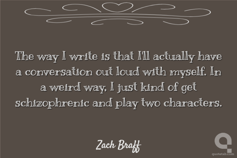 The way I write is that I'll actually have a conversation out loud with myself. In a weird way, I just kind of get schizophrenic and play two characters.