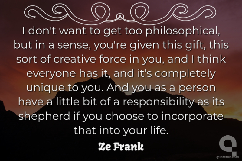 I don't want to get too philosophical, but in a sense, you're given this gift, this sort of creative force in you, and I think everyone has it, and it's completely unique to you. And you as a person have a little bit of a responsibility as its shepherd if you choose to incorporate that into your life.