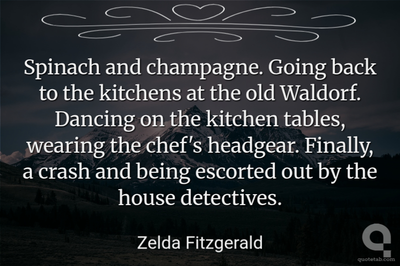 Spinach and champagne. Going back to the kitchens at the old Waldorf. Dancing on the kitchen tables, wearing the chef's headgear. Finally, a crash and being escorted out by the house detectives.