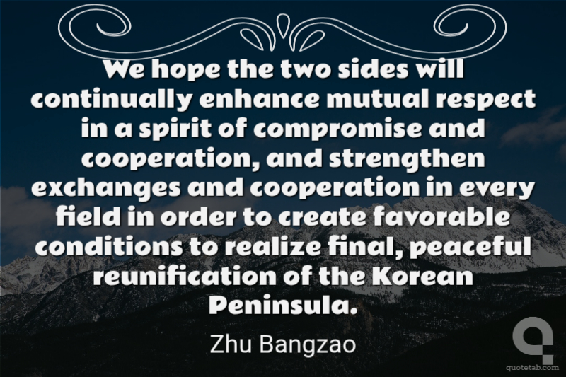 We hope the two sides will continually enhance mutual respect in a spirit of compromise and cooperation, and strengthen exchanges and cooperation in every field in order to create favorable conditions to realize final, peaceful reunification of the Korean Peninsula.