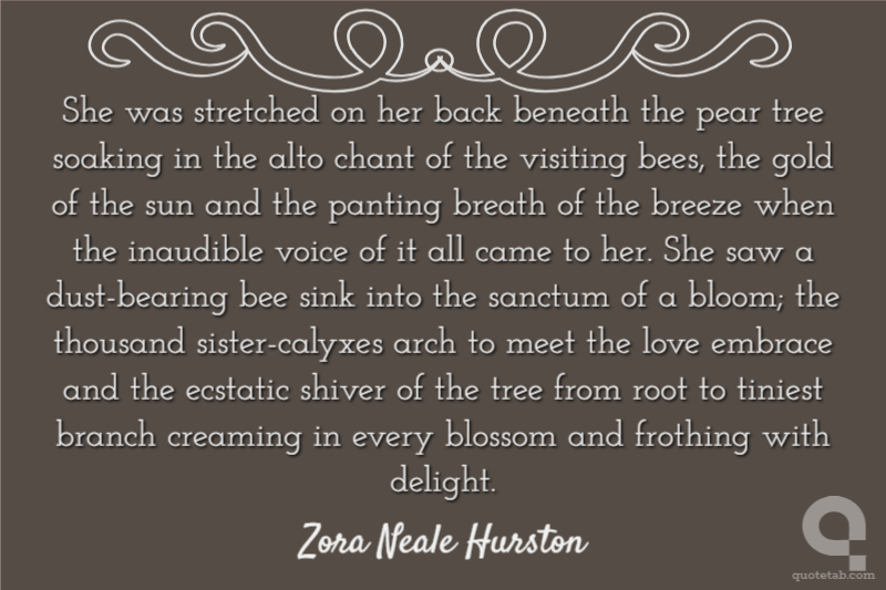 She was stretched on her back beneath the pear tree soaking in the alto chant of the visiting bees, the gold of the sun and the panting breath of the breeze when the inaudible voice of it all came to her. She saw a dust-bearing bee sink into the sanctum of a bloom; the thousand sister-calyxes arch to meet the love embrace and the ecstatic shiver of the tree from root to tiniest branch creaming in every blossom and frothing with delight.