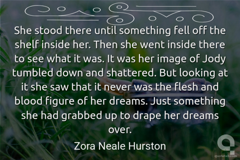 She stood there until something fell off the shelf inside her. Then she went inside there to see what it was. It was her image of Jody tumbled down and shattered. But looking at it she saw that it never was the flesh and blood figure of her dreams. Just something she had grabbed up to drape her dreams over.